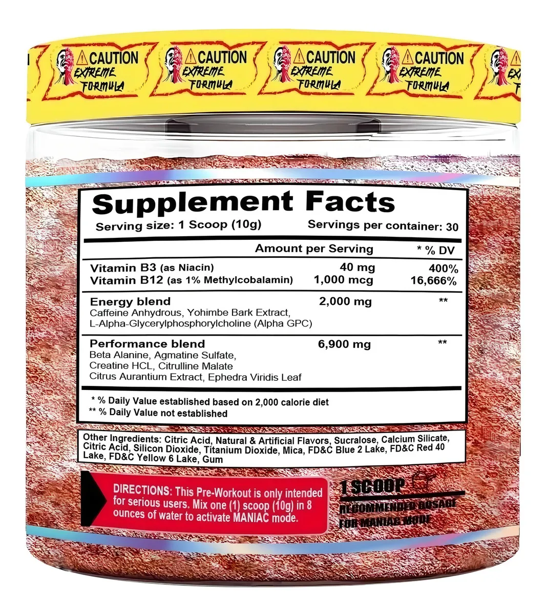 MANIAC 30 Serv – Terror Labz es un pre-entrenamiento ultra-estimulante, formulado para atletas avanzados que buscan llevar cada sesión de entrenamiento más allá del límite. Su fórmula combina altas dosis de cafeína, beta-alanina, arginina y otros nootrópicos, diseñados para encender tu sistema nervioso central, maximizar la resistencia muscular, intensificar el bombeo y llevar tu concentración a un nuevo nivel.